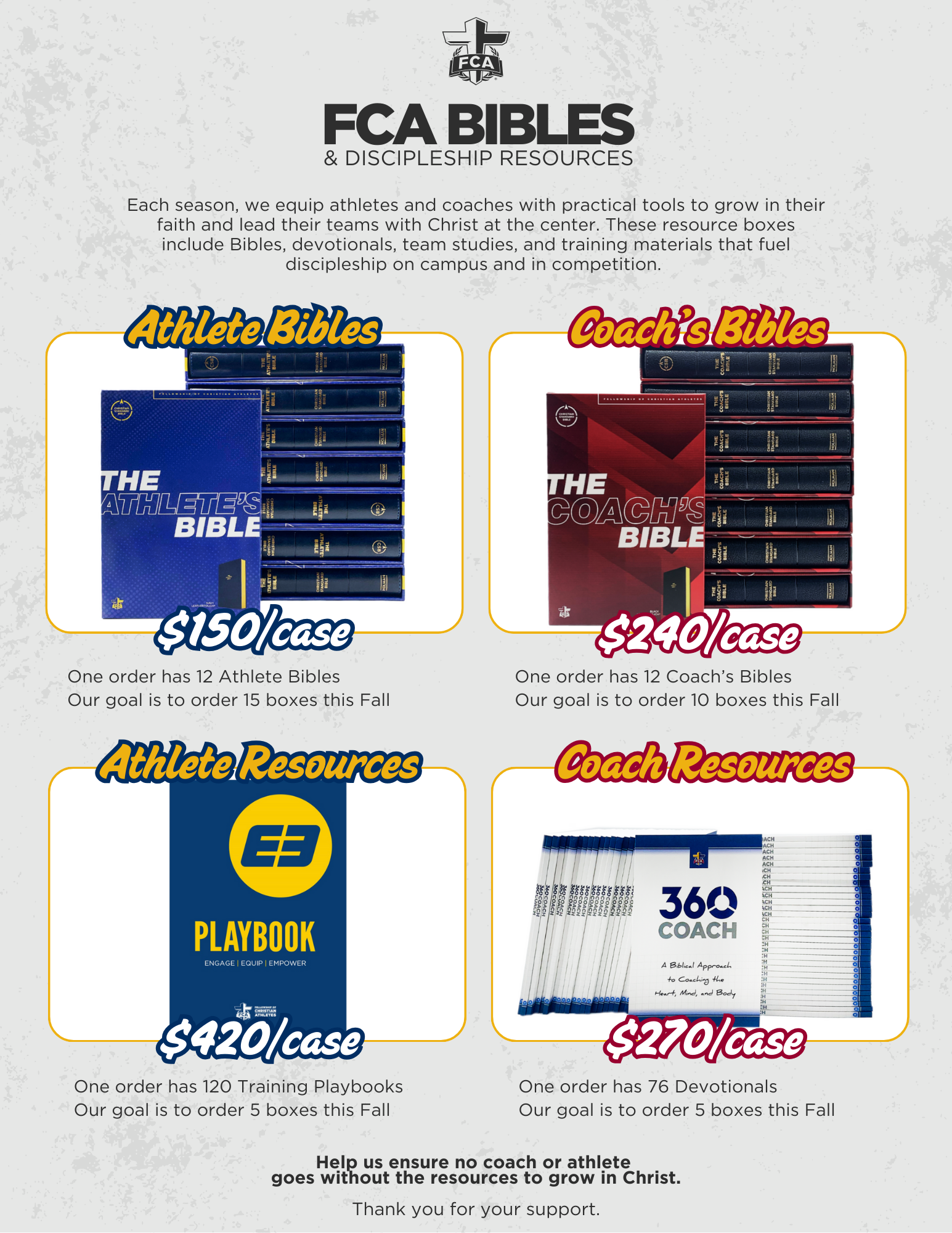 When you sponsor a bible – you are opening the door for Christ to encounter coaches and athletes with the word of God, followed by a set of fca resources to help deepen their faith.
